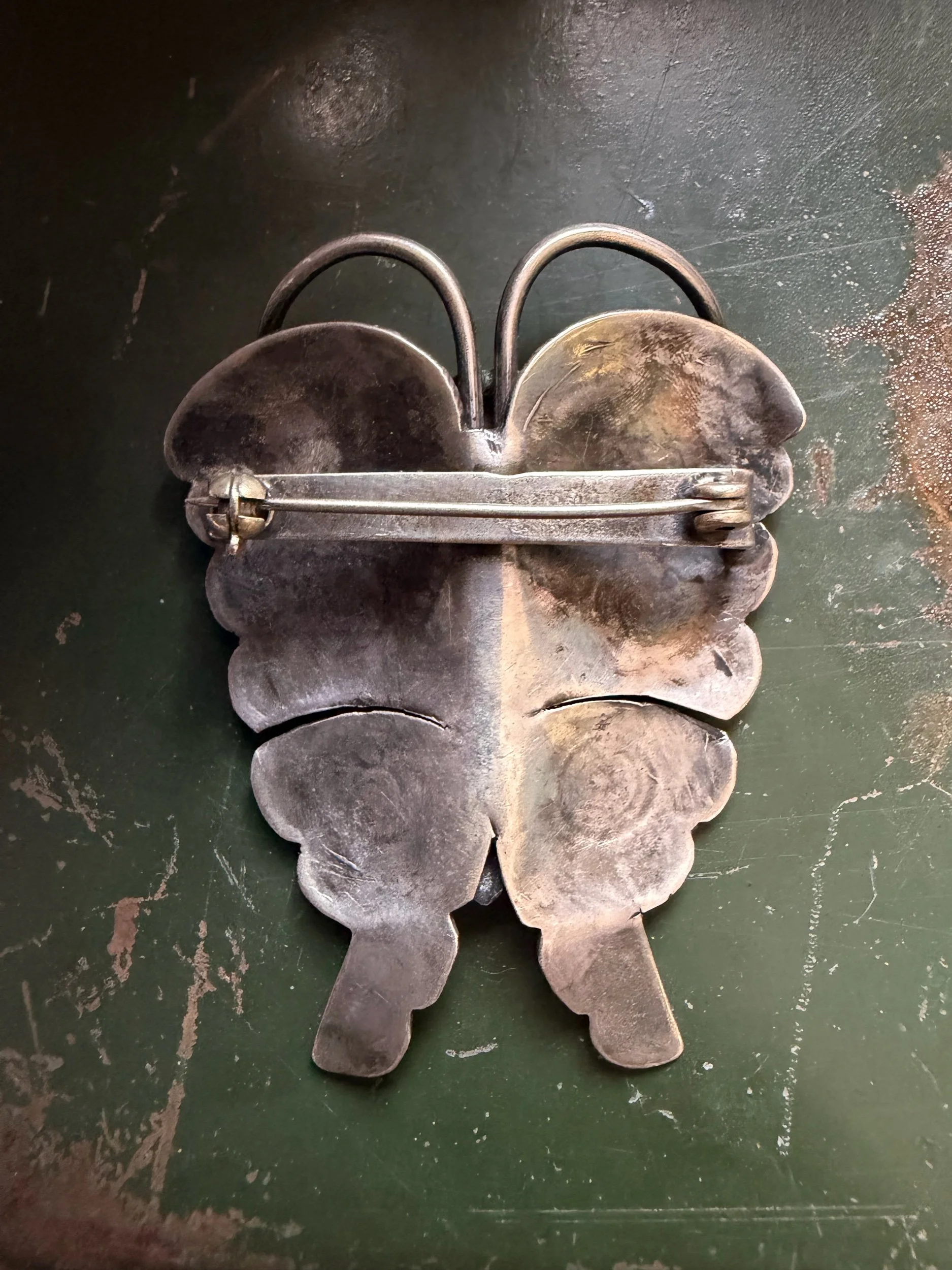 Vintage Accessories › 1940s Large Native American Butterfly Pin Image 1 of 3 Image 2 of 3 Image 3 of 3 1940s Large Native American Butterfly Pin $165.00 Sterling SilverMeasures 2” x 1 1/2”Weighs 12 Grams Add To Cart Added! Sterling SilverMeasures 2” x 1 1/2”Weighs 12 Grams